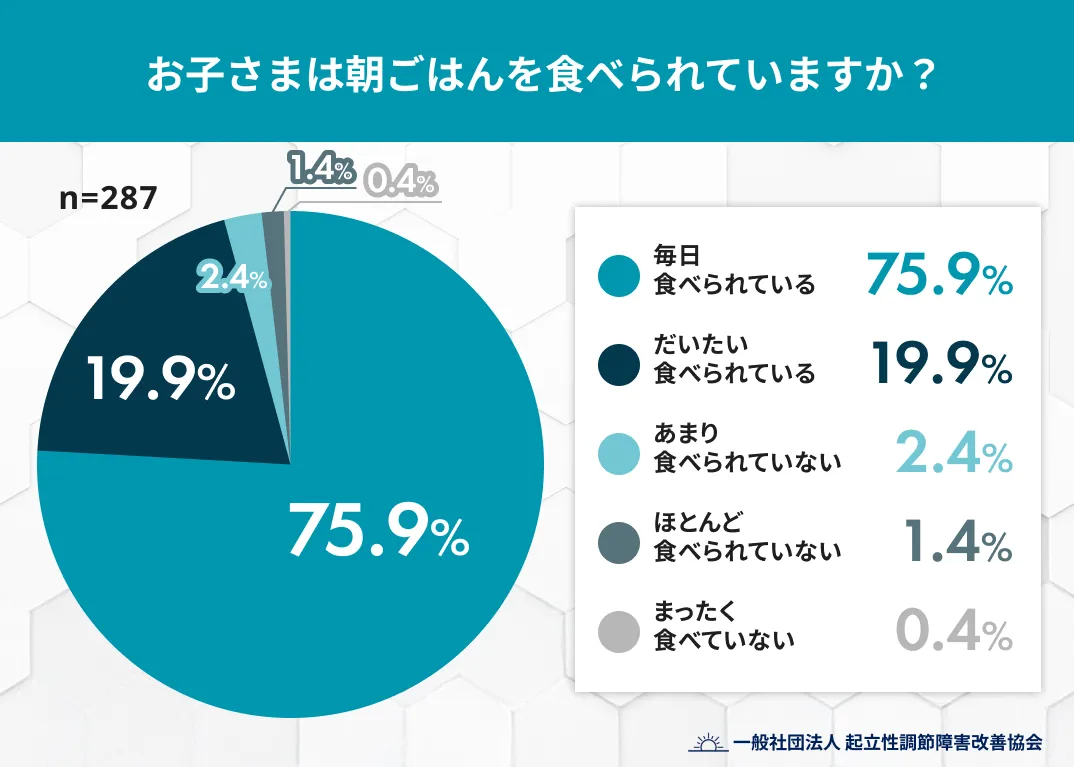 調査によると、お子さまが朝食を毎日食べる割合は75.9%に上り、「だいたい食べられている」と答えた保護者を加えると95.8%に達します。しかし、その一方で、朝食を食べることができない理由として「時間がない」「食欲がわかない」といった声が大きく挙がっています。起立性調節障害を持つ子どもたちは、特に朝に体調不良を感じやすく、そのために朝食をとることが難しいようです。