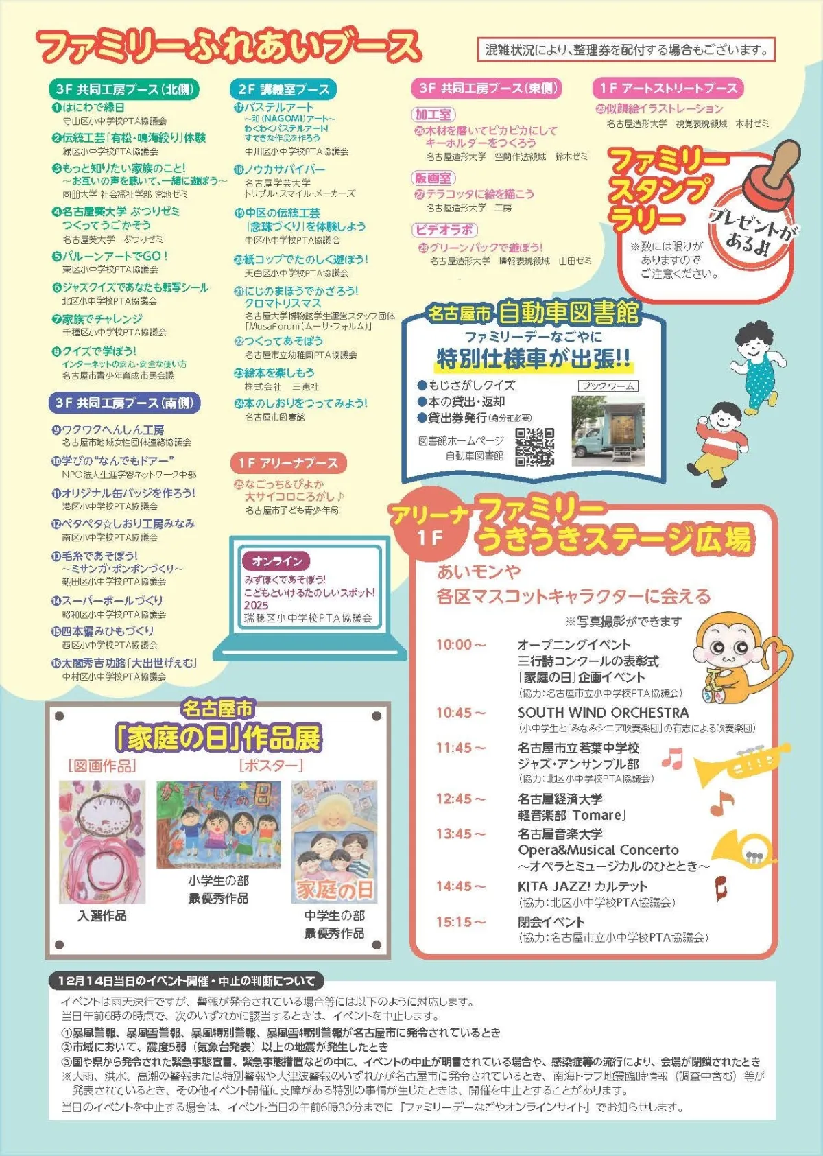 名古屋市が定める「家庭の日」をテーマにした特別なイベント、「ファミリーデーなごや」が12月14日(日)に名古屋造形大学で行われます。この日は、家族で過ごす大切な時間をみんなで楽しむためのさまざまなプログラムが用意されています。来場は無料で、予約も不要ですが、公共交通機関を利用することが推奨されています。駐車場はないため、注意が必要です。