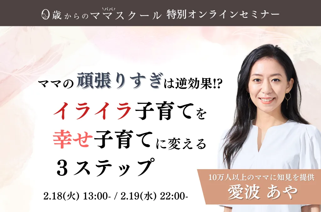 こんにちは、子育て中のママたちへ。今回は「0歳からのママスクール®」が開催する、特別なオンラインセミナーをご紹介します。このセミナーは、「イライラ子育てを幸せ子育てに変える3ステップ」をテーマにしており、2月18日と19日に開催されます。