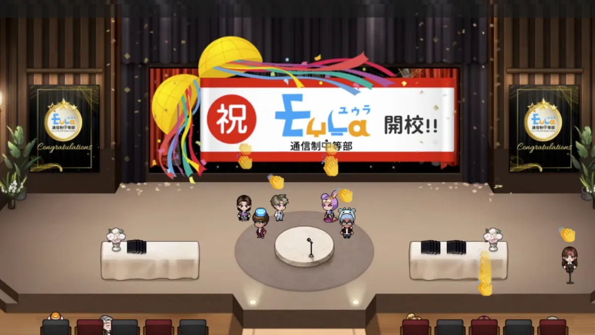 4月26日(土)に開催された開校記念式典は、オンラインのメタバース空間で行われ、全国各地から生徒や保護者、教育関係者がアバターを通じて参加しました。会場ではくす玉が割られ、参加者全員が一体となって盛り上がる温かな雰囲気が漂いました。この式典は、EuLaのコンセプト「誰もが学びの天才だ!」のもと、現代の若者に寄り添った新しい学びのスタイルを示すものでした。
