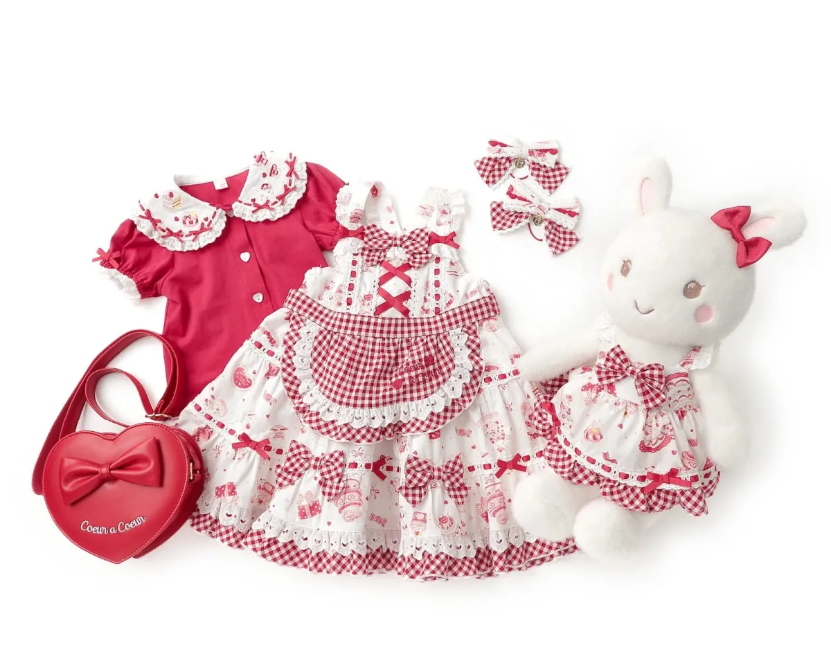 「クーラクール・プリム」は、自慢のジャンパースカート、ブラウス、ヘアアクセサリー、ハート型のショルダーバッグ、そしてかわいらしいうさぎちゃんのぬいぐるみがセットになっています。全てのアイテムは高品質な素材と細かなデザインにこだわり、特別感を演出しています。