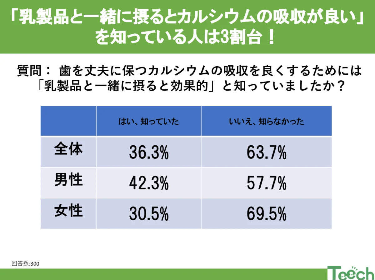 カルシウムは、歯や骨を健康に保つために欠かせない栄養素です。特に受験生は勉強で集中力が必要なため、健康的な食生活を維持することが大切。実際、アンケート調査によれば、カルシウムの摂取方法に関する知識が不足していることがわかりました。「乳製品と一緒に摂ることでカルシウムの吸収が良くなる」と知っている人は、全体の36.3%に過ぎません。さらに男女別に見ると、男性の42.3%に対し、女性は30.5%と認識度が低い傾向があります。
