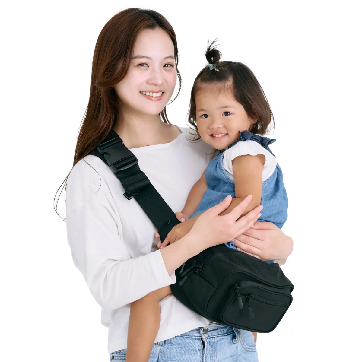 普段使っているショルダーバッグが、すぐにヒップシートに早変わりします。滑り止め付きの座面や腰をしっかりサポートするクロスが完備されており、お子さんを安心して乗せることができます。また、抱っこしていない時は、普段のバッグとして利用でき、500mlのペットボトルやおむつ、ウエットティッシュなどの必需品もきれいに収納できます。