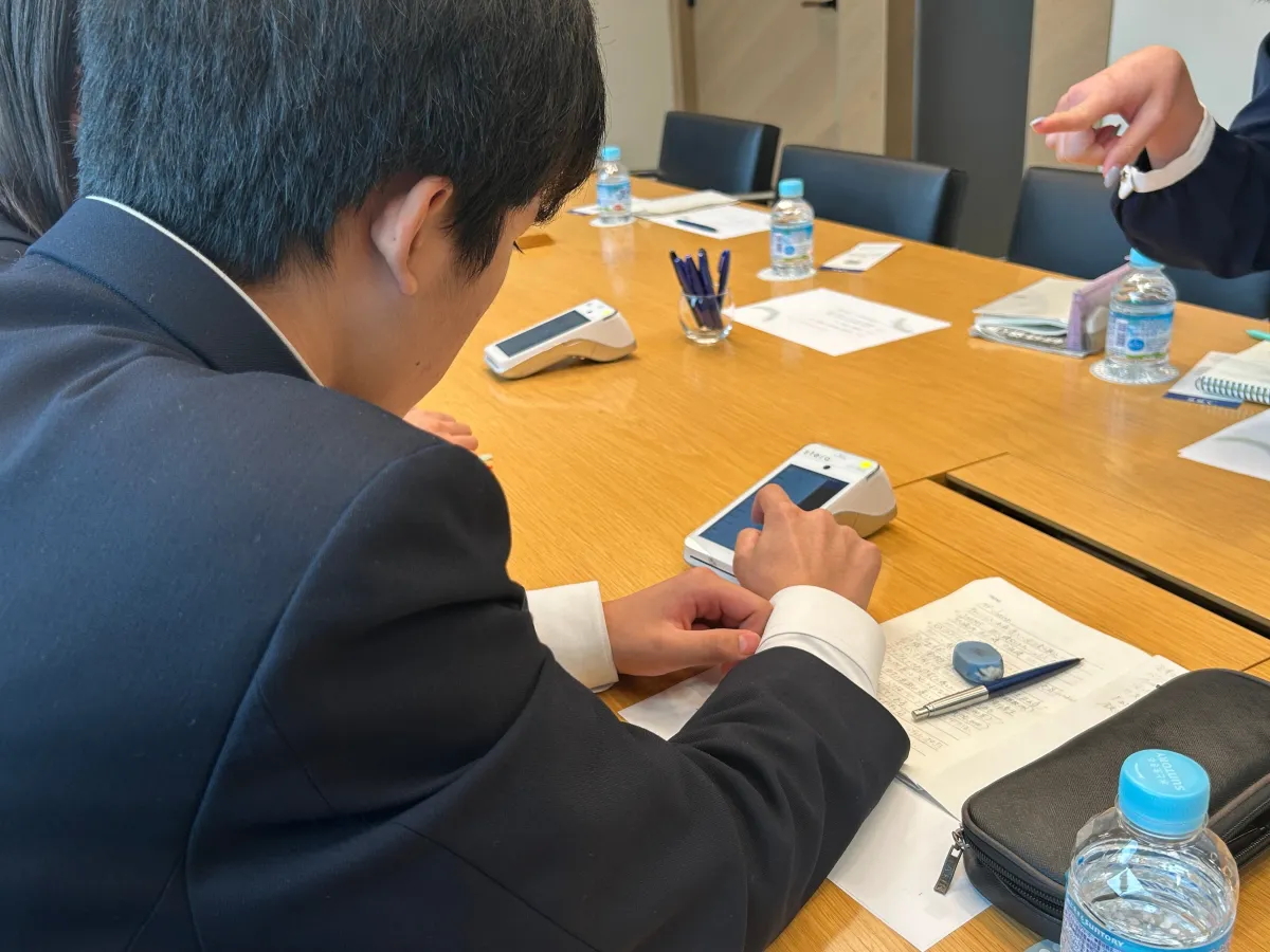 さらに、生徒たちは実際に使用されているキャッシュレス端末を操作する体験も行いました。金額を打ち込むところからレシートの発行まで、一連の流れを体験した生徒たちは「操作がより簡単で導入が容易だと感じた」「対応ブランドが多くて驚いた」などと楽しんでいました。
