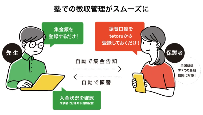 MoonAcademyが導入したtetoruの集金機能は、保護者にとっても大変便利です。オンラインで簡単に口座登録が行え、ペーパーレス化によって環境にも配慮しました。引き落とし前には通知が届くため、入金の忘れを防ぐことができ、未納時には即座に連絡が行われます。この自動化されたプロセスによって、教職員は確認作業を大幅に削減することができます。