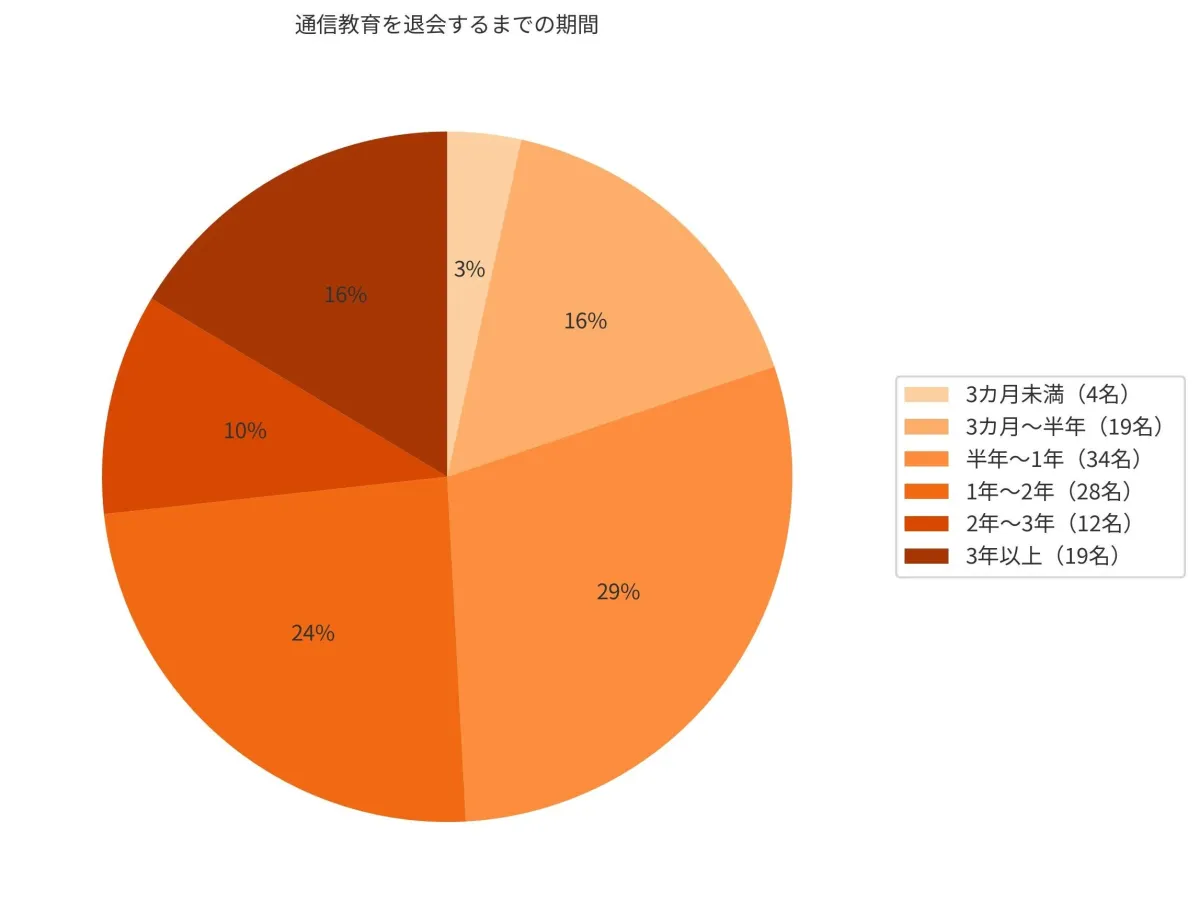 アンケートの結果によると、約50%の参加者が通信教育を始めてから1年以内に退会していることが分かりました。特に、半年から1年の間に退会する人が最も多く、次いで1年から2年までの期間が多く見受けられました。一方で、3カ月未満で退会した方はわずか4名であり、やはり教育内容をしっかりと理解し、成果を感じるには3カ月以上の時間が必要であることがわかります。