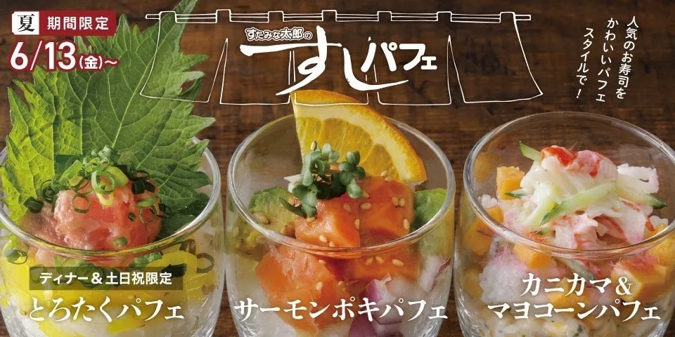遊び心満載の「寿司パフェ」や、スパイシー焼肉、お酒にぴったりなおつまみなど、様々なメニューが揃った「すたみな太郎」の夏の新メニュー。この機会に、友達や家族と一緒に訪れて、楽しい食事のひとときを過ごしてみてはいかがでしょうか。