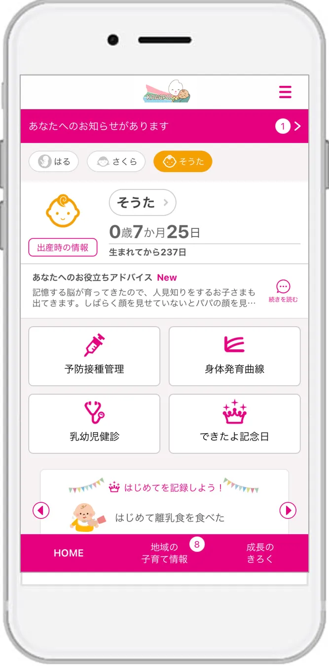 新たに採用された『KAWAPO 親子健康手帳アプリ』は、妊娠から育児まで一貫して支援する機能が豊富に揃っています。妊産婦や子どもの健康データの記録管理、予防接種のスケジュール管理、出産や育児に関するアドバイスの提供など、多岐にわたるサービスが用意されています。特に、育児日記として使える「できたよ記念日」という機能は、子どもの成長を写真やメッセージとともに記録することが可能です。これにより、家族での共有もでき、成長の目安としても利用できる仕組みとなっています。