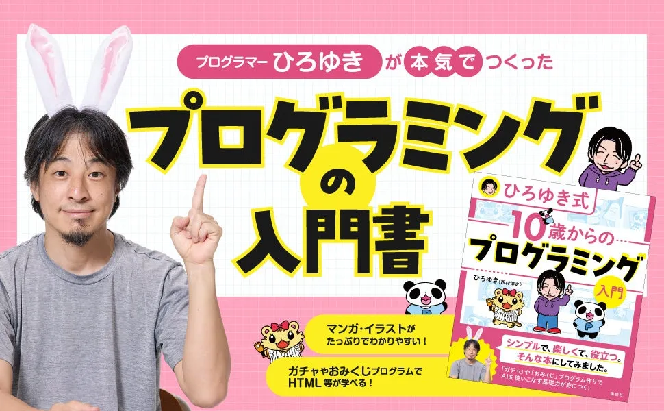 日本を代表するプログラマーであり、人気YouTuberでもあるひろゆき(西村 博之)氏が、子ども向けのプログラミング入門書『ひろゆき式 10歳からのプログラミング入門』を2025年9月24日に発売します。本書では、子どもが楽しくプログラミングを学べる仕掛けが満載で、プログラミングへの興味を引き出す内容となっています。