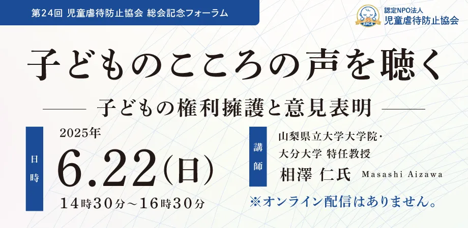 2025年6月22日(日)に開催される第24回児童虐待防止協会総会記念フォーラムでは、子どもたちの権利とその意見表明について深く掘り下げる機会が提供されます。このフォーラムは、改正児童福祉法の施行を受け、虐待を受けて保護されている子どもたちの意見をどのように尊重し保障するかという重要なテーマに焦点を当てています。