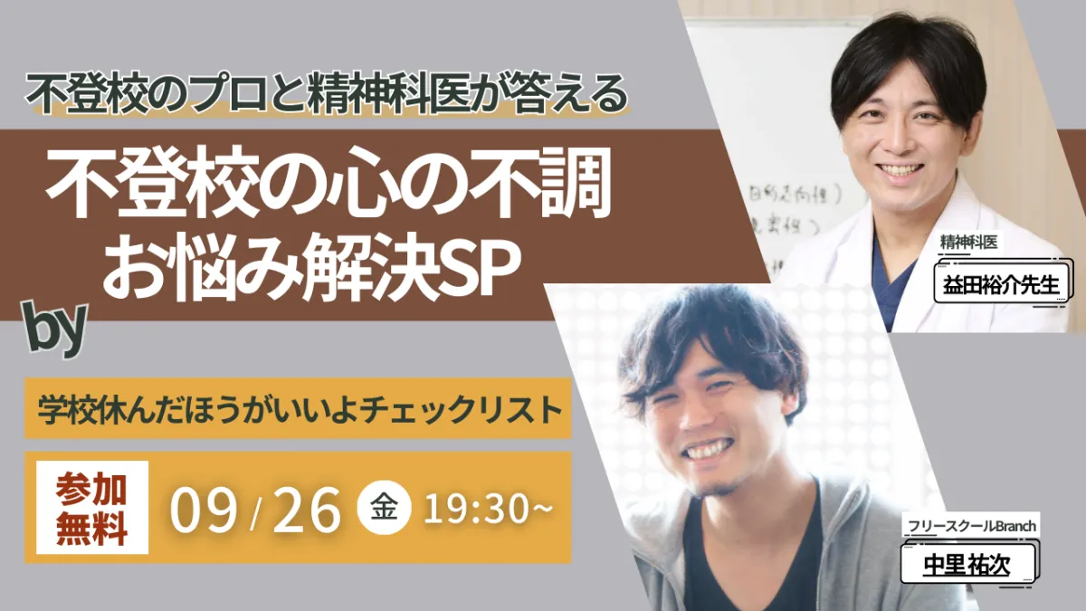 不登校という言葉が耳にする機会が増えていますが、子どもを持つ保護者にとって、その対応は悩ましい問題です。2025年9月26日(金)19:30から、精神科医の益田裕介先生が、特別な無料オンラインイベントを開催します。このイベントでは、「学校休んだほうがいいよチェックリスト」を運営する3つの団体が集まり、不登校の悩みを抱える保護者のために、具体的なアドバイスを提供します。