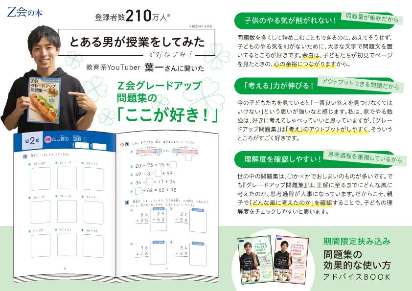 この春、対象となる書店でZ会の「グレードアップ問題集」「思考力ひろがるワーク」「ことばあそびワーク」シリーズを購入すると、葉一氏が監修したオリジナルの特典がもれなく付いてきます。オリジナル特典には「おうち学習応援アドバイスBOOK」が含まれており、学習を進めるための貴重なアドバイスが詰まっています。このアドバイスBOOKは、「ヨツバ」と「サクラ」の2種類があり、それぞれ異なる学びのポイントが解説されています。