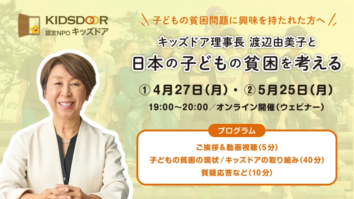 認定NPO法人キッズドアが主催するオンライン勉強会が、2026年4月27日と5月25日に開催されます。この勉強会では、理事長の渡辺由美子が日本の子どもの貧困について直接解説し、日常生活で直面する現実の課題に光を当てます。