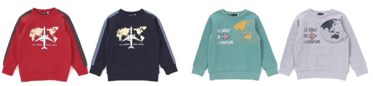 こちらのトレーナーでは、大きな地球儀のプリントが大胆に施されており、さらに飛行機のワッペンがついています。このデザインは、遊び心満載で、子どもたちを旅行に連れて行きたくなるような高揚感を演出しています。
