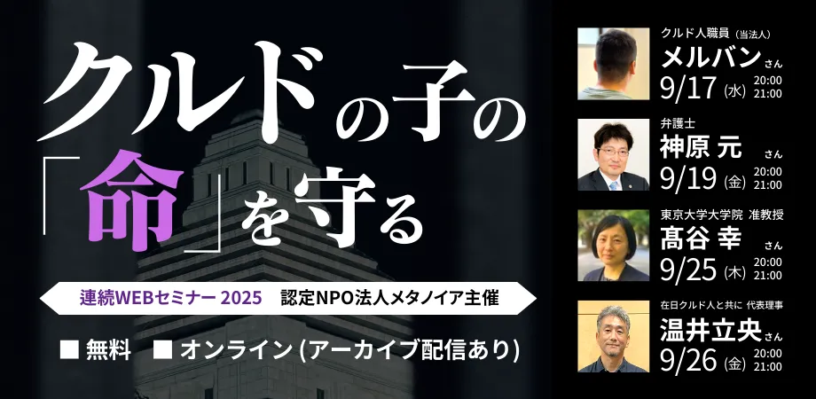 認定NPO法人メタノイアが主催する「クルドの子どもの「命」を守る」セミナーシリーズが、9月17日からオンラインで開催されます。このイベントは、埼玉県に暮らすクルドの子どもたちが直面している現状に焦点を当てており、特にクルド人に対するヘイトスピーチが問題視されています。子どもたちが受ける影響や、社会全体でどう保護していくかを共に考える機会となります。