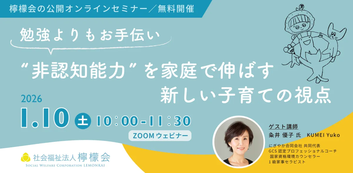 2026年1月10日、社会福祉法人檸檬会が主催する無料オンラインセミナーが開催されます。このセミナーでは、子供の自己肯定感や自立力を育てるための「お手伝い・家事」の価値について、ゲスト講師の粂井優子さんが詳しく解説します。