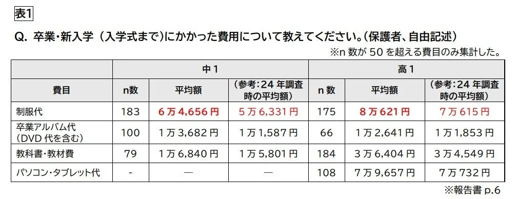 この調査は、経済的な課題を抱える世帯を対象に行われ、主にひとり親世帯や女性が多く含まれています。調査結果では、中学・高校の卒業や入学にかかる具体的な費用について「制服代」「卒業アルバム代」「教科書・教材費」「パソコン・タブレット代」などが挙がり、特に制服代は前年から約1万円も上昇しています。