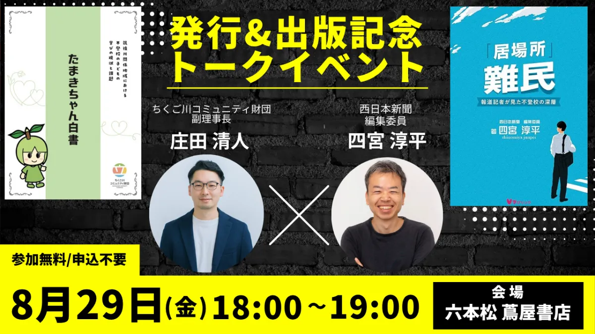 8月29日には、六本松蔦屋書店にて「たまきちゃん白書」と「居場所難民」の出版を祝うトークイベントが行われます。このイベントでは、白書発行に関わった庄田清人副理事長と、西日本新聞編集委員の四宮淳平さんが、対談形式で不登校の現状について語ります。参加は無料で、事前の申し込みは不要ですが、定員は30名となっています。