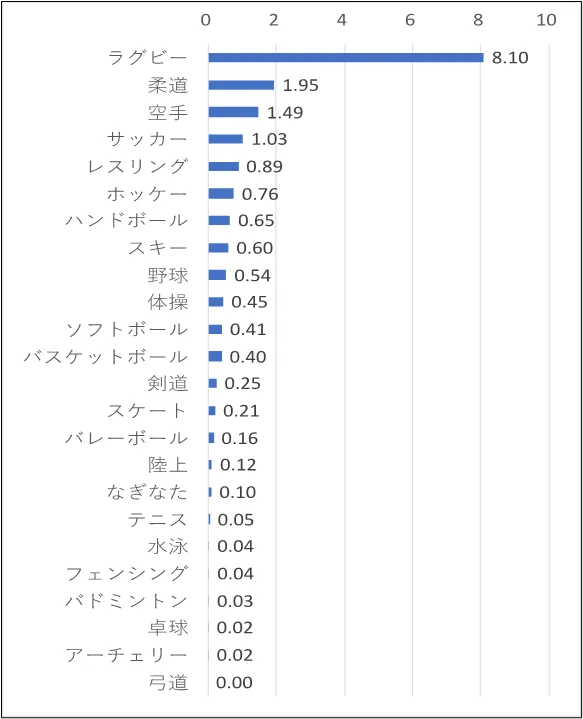 ラグビーを始めとするコンタクトスポーツでは、試合中だけでなく練習中にも多くの脳振盪が発生します。研究結果に基づくと、ラグビーの発生件数が最も多く、柔道、空手も高い発生率を示しました。一方で、非コンタクトスポーツでも練習中に脳振盪が起きていることが確認されています。