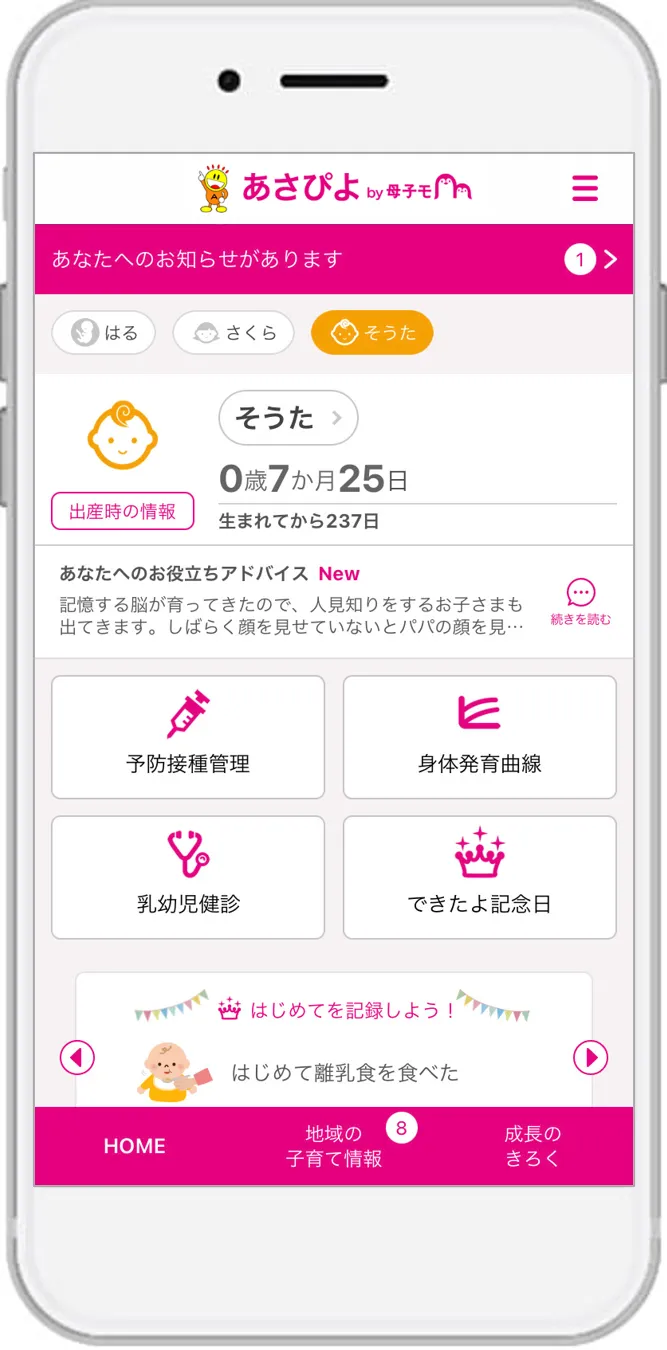『あさぴよ』は、スマートフォンやタブレット、PCで利用可能な母子手帳アプリで、妊娠中の体調や子どもの成長データを記録することができます。予防接種のスケジュール管理や健診結果の記録もスマートに行えるため、手書きでの管理にとらわれることがなくなり、忙しいママやパパには嬉しい機能です。また、クラウドにデータが保存されるため、万が一手帳を紛失してしまった場合でも安心です。