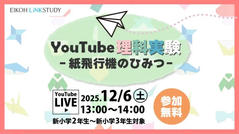 2025年12月6日、オンライン進学塾「EIKOH LiNKSTUDY(栄光リンクスタディ)」が、小学1・2年生を対象にした無料の「YouTube理科実験―紙飛行機のひみつ―」を開催します。このイベントは、紙飛行機の動きや構造を学びながら、実際に飛ばす体験ができる貴重な機会です。