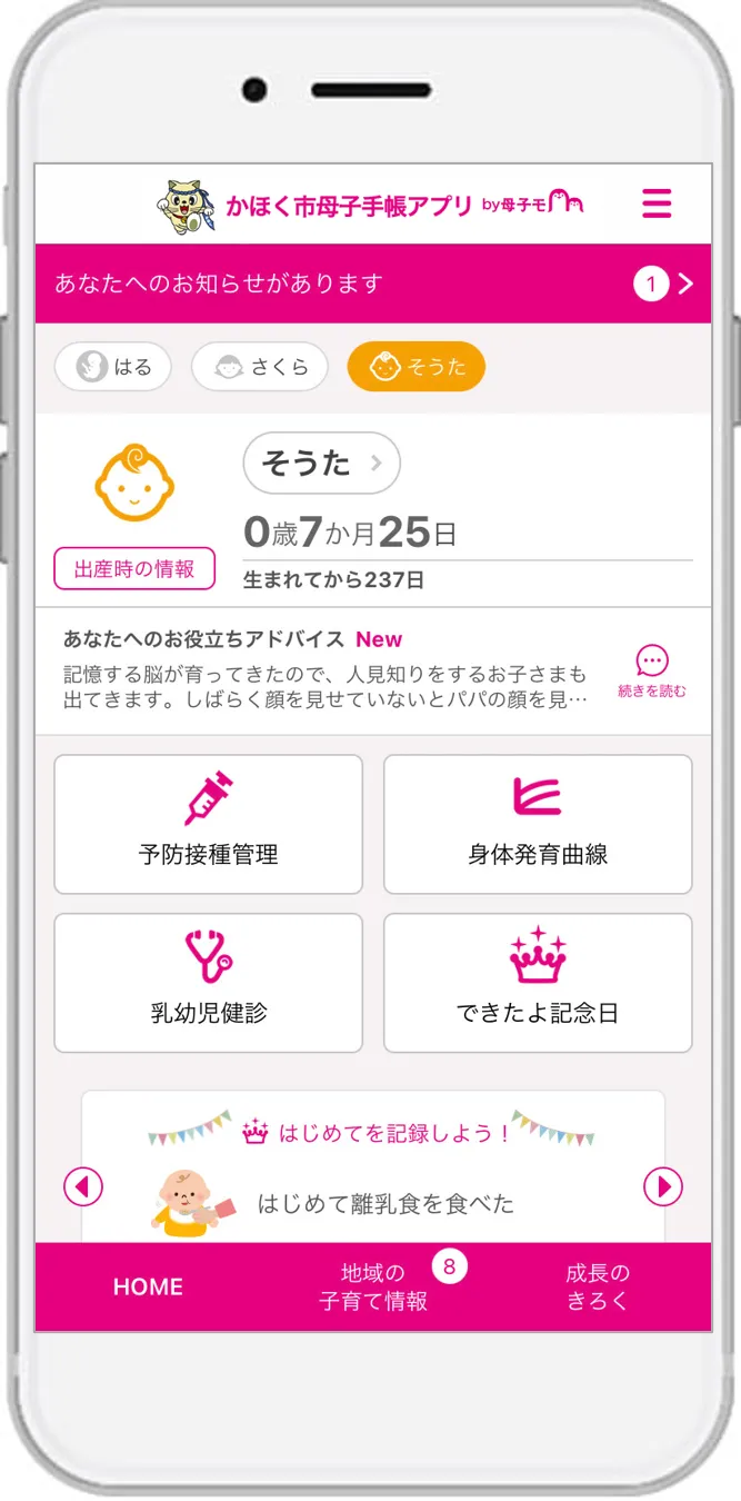 『かほく市母子手帳アプリ』は、スマートフォン、タブレット、PCでも利用でき、妊娠や子供の健康データを手軽に記録・管理できるのが特徴です。主な機能としては、