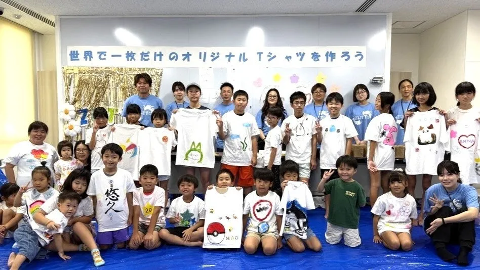 当日、子どもたちは真っ白なTシャツに思い思いの絵を描き始めました。カラフルな絵具を使い、動物や花、キャラクターのイラストが次々と完成していきます。自由な発想で表現する姿に、大人たちも微笑ましく見守っていました。各回約30名が参加し、子どもたちの真剣な表情と楽しそうな笑顔が印象的でした。記念撮影の際、完成したTシャツを自慢げに掲げる子どもたちの姿がとても輝いていました。