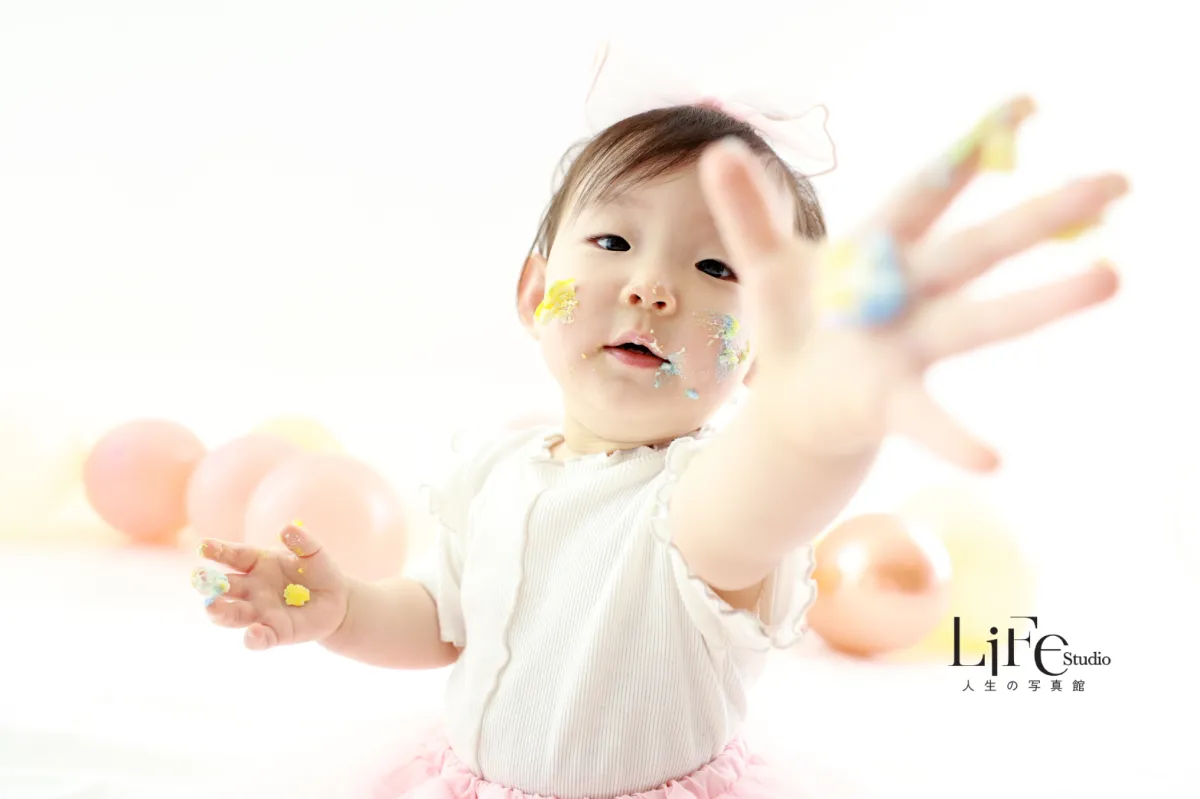 ライフスタジオ大阪一号店は自然光がたっぷりと入るハウス型スタジオです。スマッシュケーキを使った撮影では、本物のケーキに触れつつ、思わず笑顔がこぼれる瞬間を切り取ります。お子様の無邪気な笑顔を最大限に引き出した、特別なフォトセッションとなるでしょう。