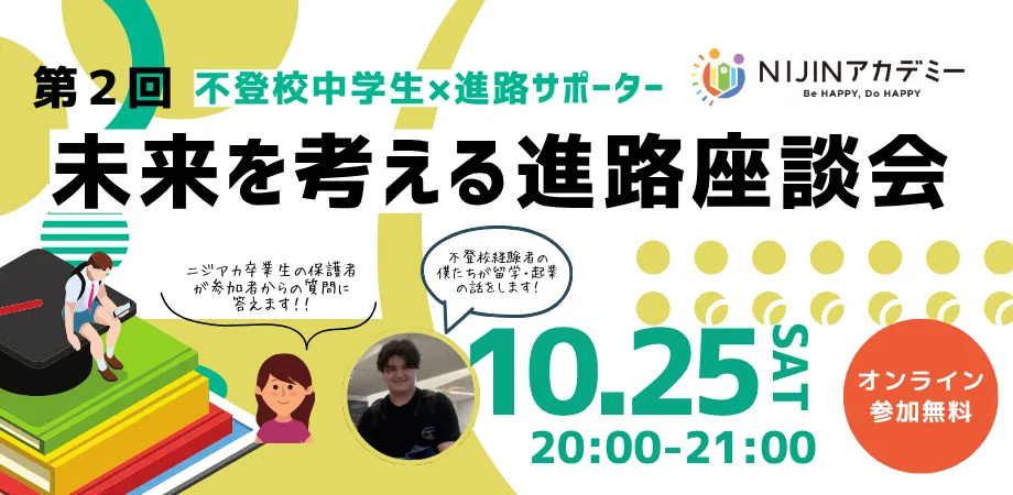 2023年10月、株式会社NIJINが主催するオンラインイベント「未来を考える進路座談会」が開催されました。このイベントは、不登校の小中学生とその保護者を対象に、進路やキャリアについての選択肢を模索する場として企画されたものです。