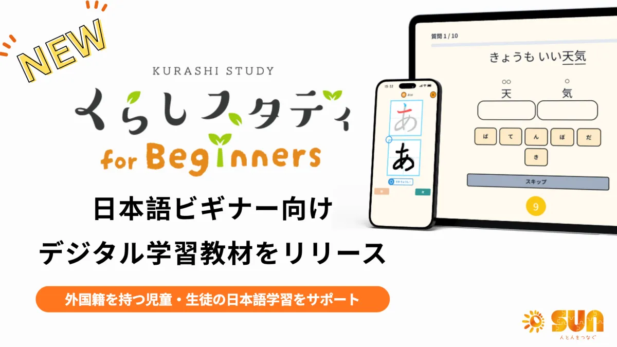 オフィシャルなリリースとして、2025年10月10日(金)より、SUN株式会社が提供する日本語ビギナー向けデジタル学習教材「くらしスタディ for beginners」の提供を開始します。この教材は、特に増加傾向にある外国籍児童・生徒を対象にデザインされており、彼らが抱える学習の課題に取り組むために開発されました。