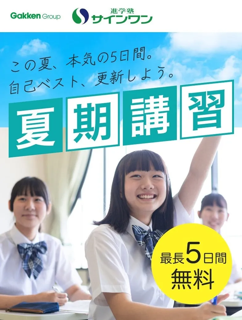 進学塾サインワンでは、夏期講習の授業を最大で5日間無料で体験することができます。これにより、お子様が自分に合った塾かどうかを実際に確認できる貴重な機会が提供されます。体験授業の内容はコースによって異なりますので、詳細についてはお問い合わせが必要です。