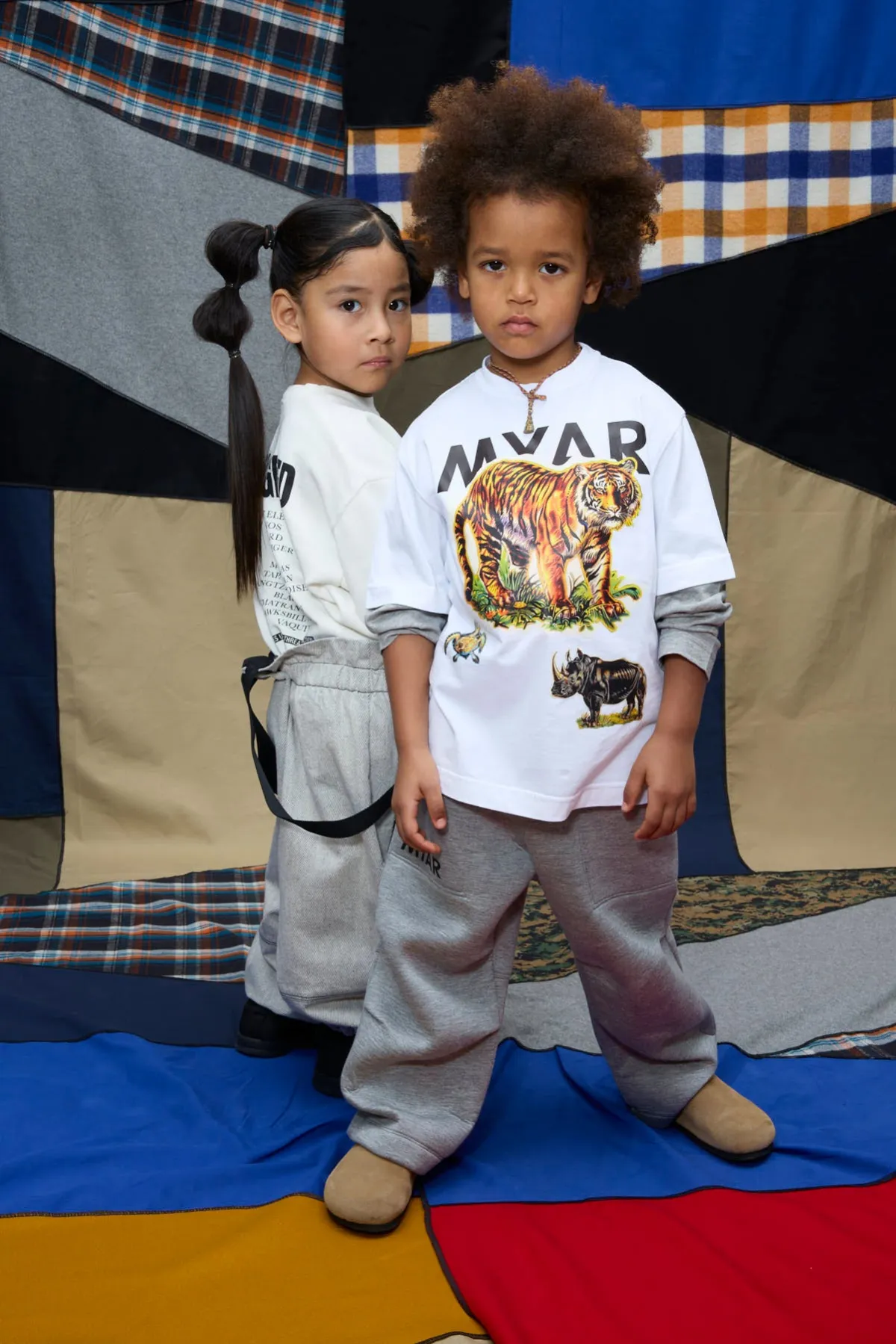 今季のMYAR KIDSのコレクションは「絶滅危惧種」がテーマです。子どもたちが未来に出会うことができないかもしれない動物たちに対する意識を高めることを目的としています。Tシャツやスウェットには、パッチワークプリントやダイナミックな動物のグラフィックが施され、バックスタイルには環境保護についての強いメッセージが込められています。そして、すべてのプリントには環境に優しいバイオベース染料が使用されています。