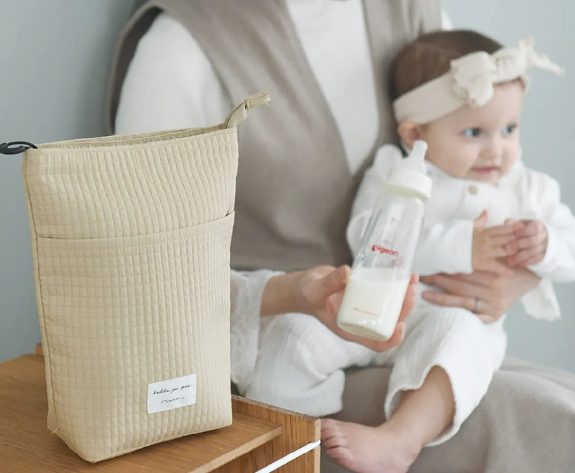 この新しい哺乳瓶ポーチは使いやすさを考え、愛用者からのリクエストをもとに開発されました。ミルクの持ち運びに必要な哺乳瓶、粉ミルク、そしてお湯を入れたタンブラーをすっきり収めることができます。また、外側には赤ちゃんのお口を拭くためのガーゼタオルを収納できるポケットも完備。
