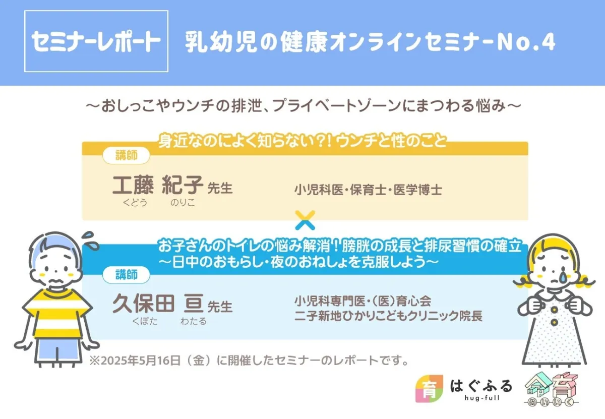 2025年5月16日(金)、はぐふると命育が共同で開催した「乳幼児の健康オンラインセミナー」第4回目が無事に終了しました。このセミナーは、「排便と性教育」「おねしょと夜尿症」というテーマを取り上げ、小児科の専門家を迎え、乳幼児の排泄に関する重要な知識を深めるための貴重な場となりました。
