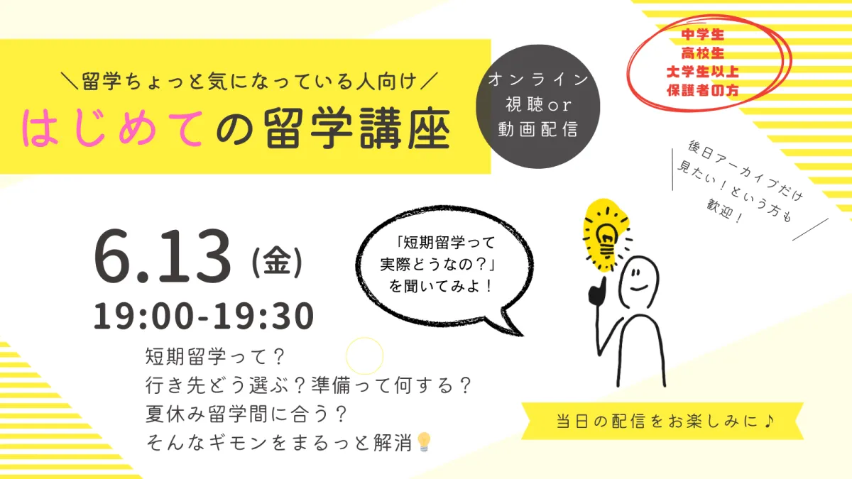 留学を考えているけれども一歩が踏み出せない、そんな方にぴったりのオンラインセミナー『はじめての留学講座』が、2025年6月13日(金)に開催されます。主催は、グローバル教育支援を行っている株式会社イクシル。留学の基本から短期プログラムの選び方まで、幅広い知識を得られるこのセミナーは、参加費が無料で、多くの中高生や大学生、さらには保護者も対象にしています。