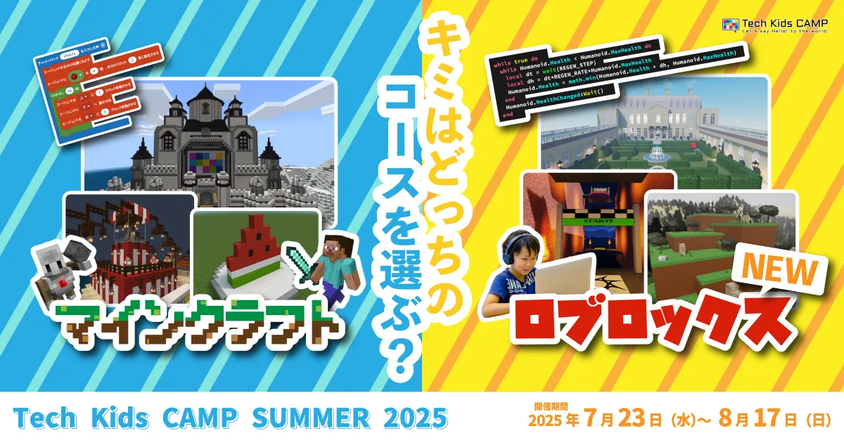 「Tech Kids CAMP」は、楽しい環境でプログラミングの基礎を学び、創造性を育む姿勢を促すことが目的です。2025年7月下旬から8月中旬の間、東京・渋谷で行われるこのプログラムでは、参加者はマインクラフトコースとロブロックスコースのいずれかを選択できます。
