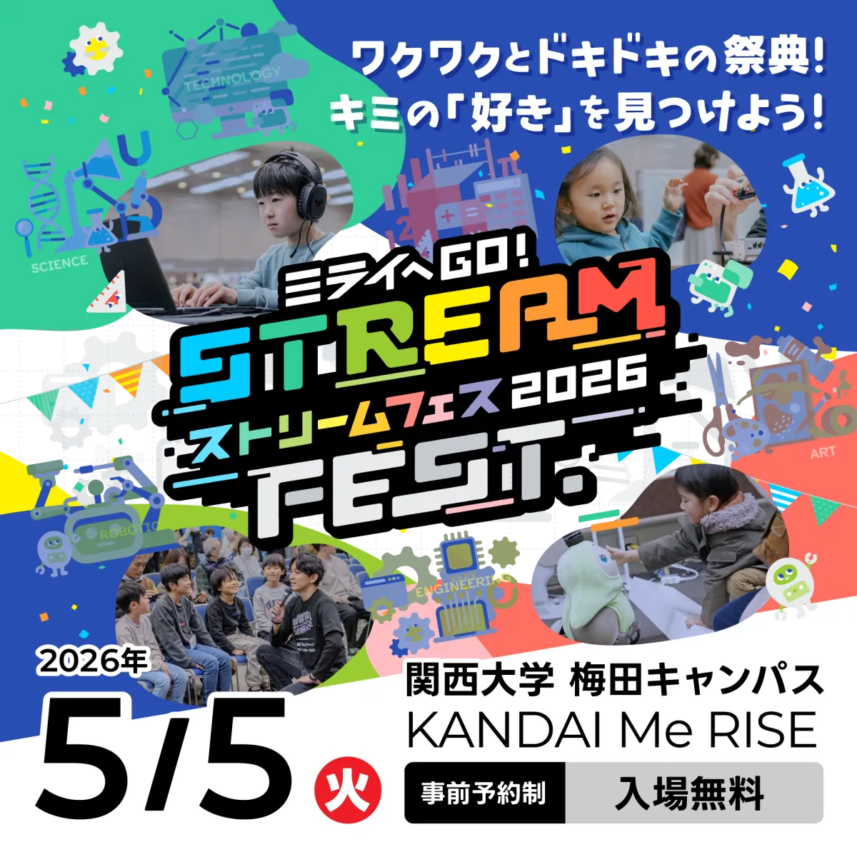 2026年5月5日、こどもの日に開催される「STREAM FEST.2026」。ここでは、小中学生を対象に、科学、技術、ロボット、工学、芸術、数学という分野に触れる体験型イベントが行われます。このイベントでは、子どもたちが未来に向けて新たな可能性を広げるお手伝いをします。
