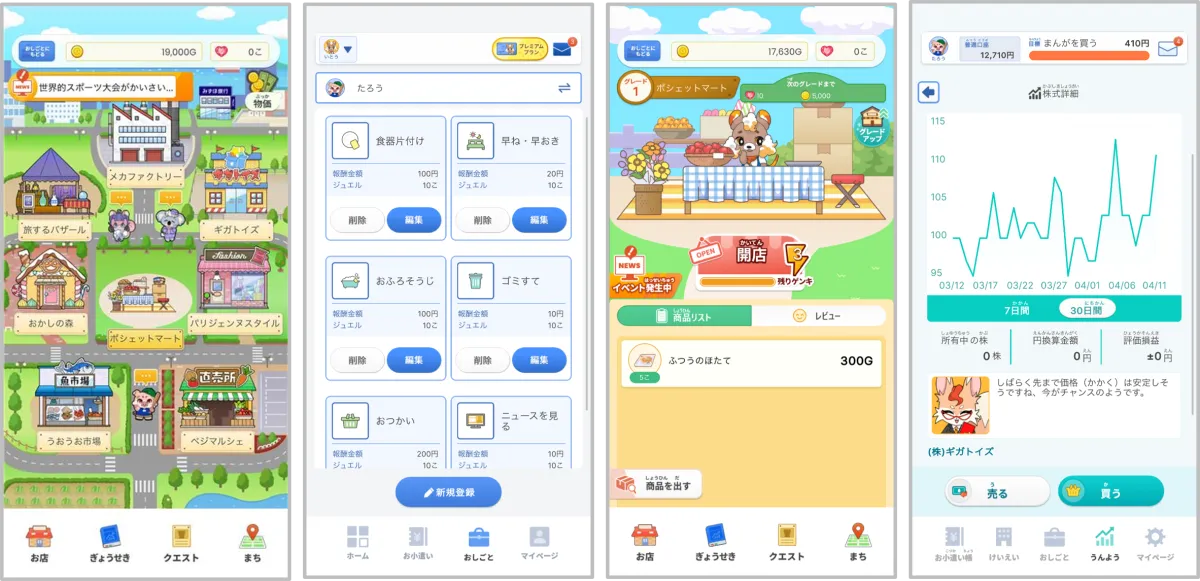 PochettePlusは、親子で楽しくお金の役割や経済について学べるアプリです。以下の3つの機能が用意されています。