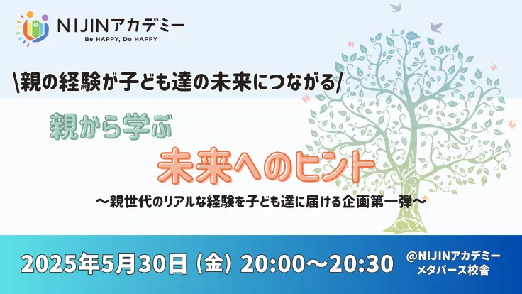 このオンラインイベント「未来への一歩シリーズ~親から学ぶ未来へのヒント~」は、2025年5月30日の20時から30分間にわたり、NIJINアカデミーのメタバース校舎特設会場にて実施されます。参加にあたってはPCまたはタブレット端末が必要となります。