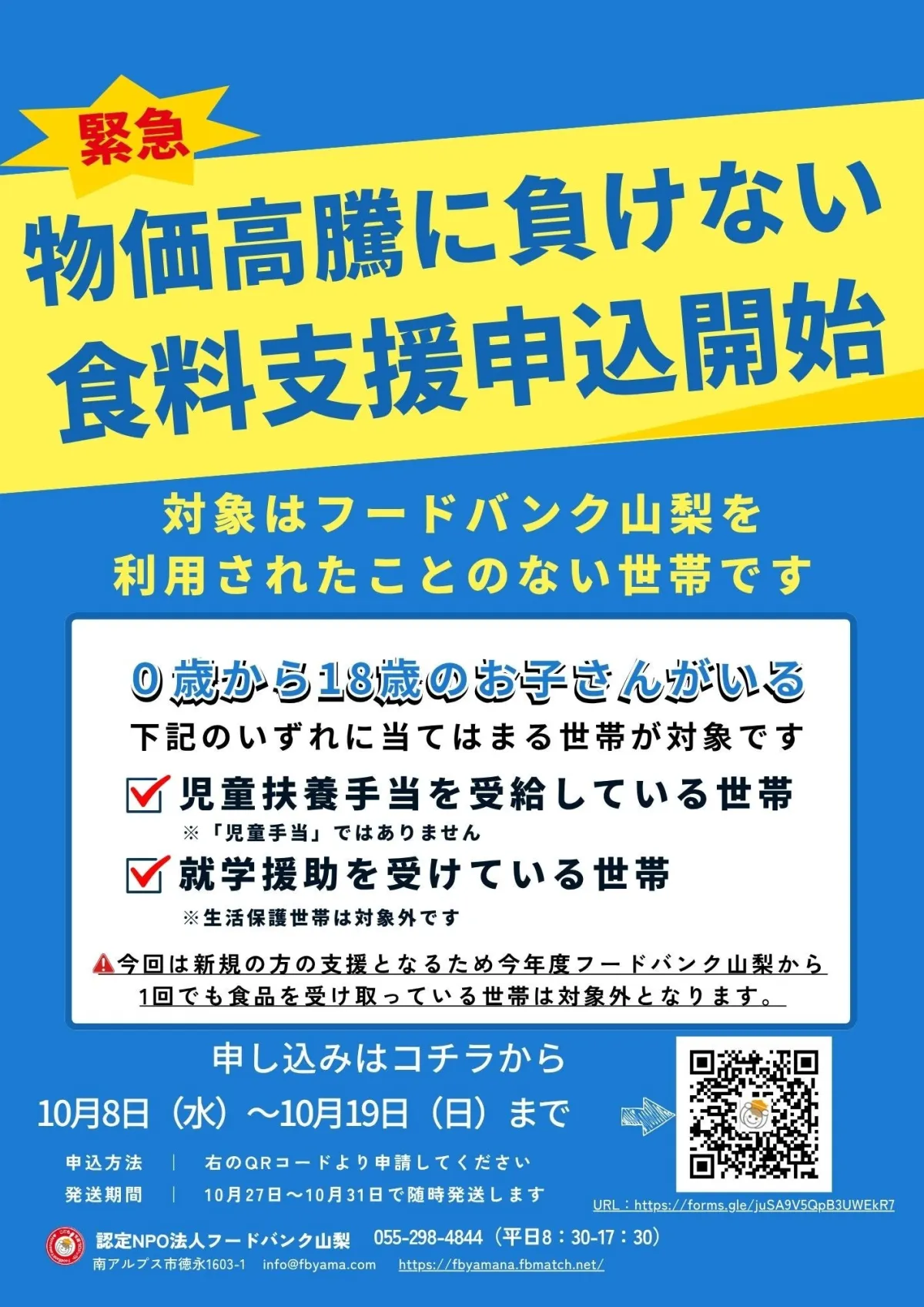 フードバンク山梨は、こうした状況を受けて、2025年10月28日(火)から31日(金)まで「緊急食料支援」を実施します。対象となるのは、就学援助や児童扶養手当を受給している家庭で、新たに支援を希望する世帯となっています。申し込み期間は、2025年10月8日から19日までで、専用のフォームまたはQRコードを通じて簡単に手続きが可能です。