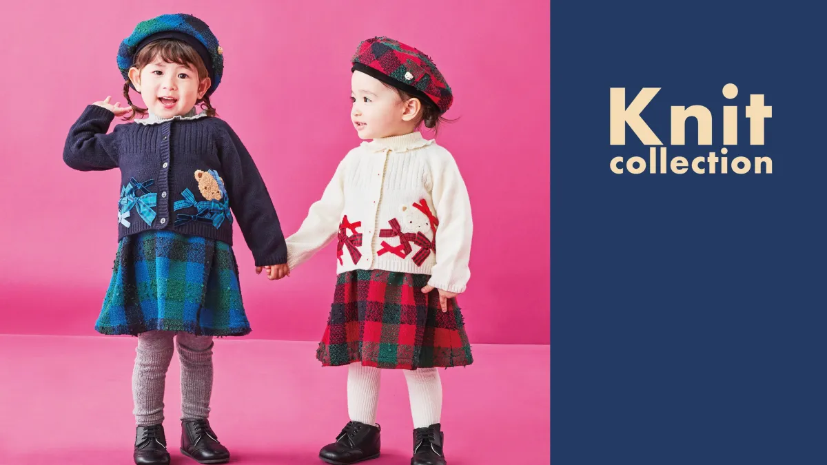 新作のニットコレクションは、ベビーからキッズサイズまで豊富なラインナップを揃えており、トップスや小物としてのアイテムもございます。特に人気の高いファミちゃんリアちゃんデザインのニットが新たにアウターや帽子、手袋としても登場しています。この暖かみのあるニットアイテムなら、冬の寒さも楽しく乗り切れること間違いなしです。