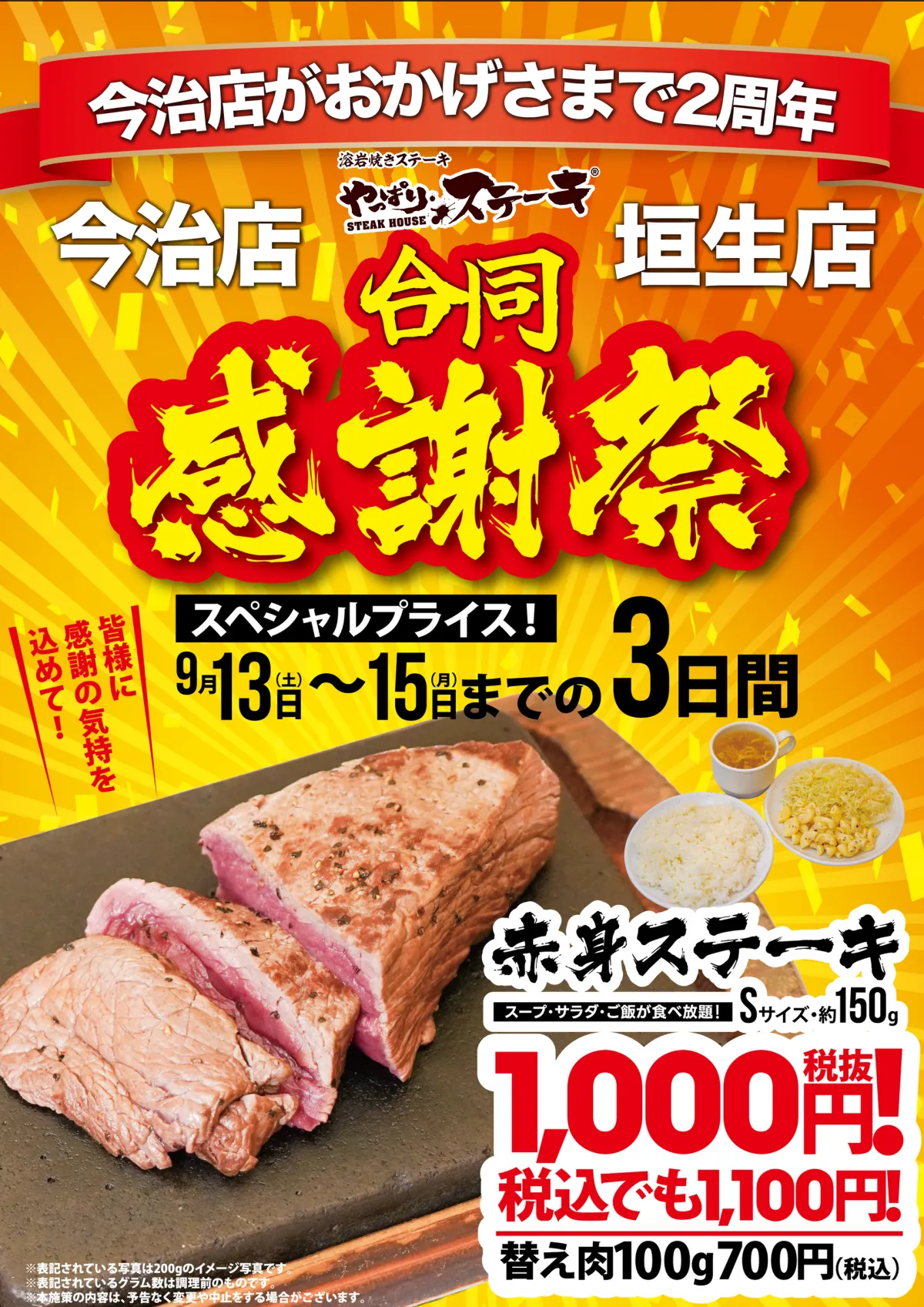 やっぱりステーキ今治店が、開店2周年を迎えました。この特別な節目を祝して、同じく愛媛県にある垣生店との合同で、特別な3日間の感謝祭を開催します。期間は、2025年9月13日(土)から15日(月)までの3日間。来店いただいた皆様への感謝の気持ちを込めて、特別価格でおいしい赤身ステーキをご提供いたします。