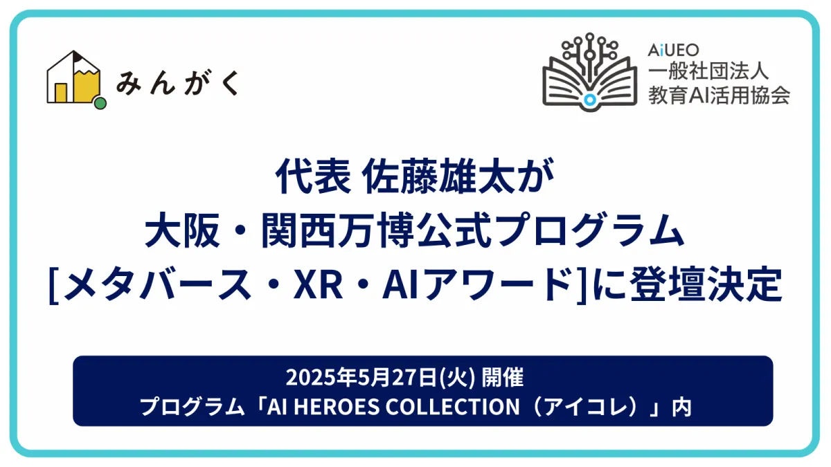 2025年5月27日、大阪・関西万博において、株式会社みんがくの代表佐藤雄太氏が「メタバース・XR・AIアワード」の公式プログラムに参加することが決まりました。佐藤氏は一般社団法人教育AI活用協会の代表理事として、教育とAIの融合に関する講演を行います。このプログラム内の「AI HEROES COLLECTION(アイコレ)」では、テクノロジーがどのように教育の未来を切り開くかについて、自身の経験や専門的な知見を基に語る予定です。