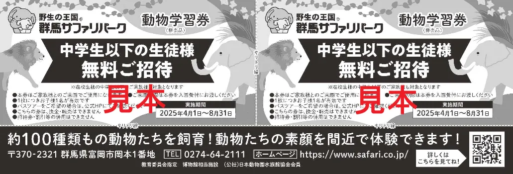 この券を持つ児童・生徒は、家族を同伴することで群馬サファリパークへ入園が可能となります。家族の入園は通常料金となりますが、追加料金で園内バスツアーにも参加することができます。なお、他の割引券との併用はできないため、利用する際はご注意ください。