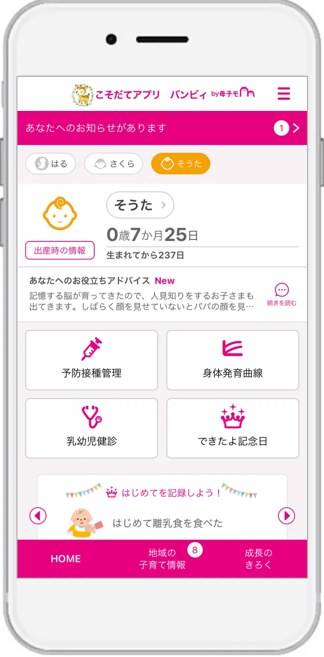 導入された『こそだてアプリバンビィ』は、妊産婦や子どもの健康データを記録・管理し、祖父母などの遠方にいる家族とも情報共有が可能です。日々の子育ての中で、「できたよ記念日」機能を通じて子どもの成長を記録したり、育児日記として活用することもできます。