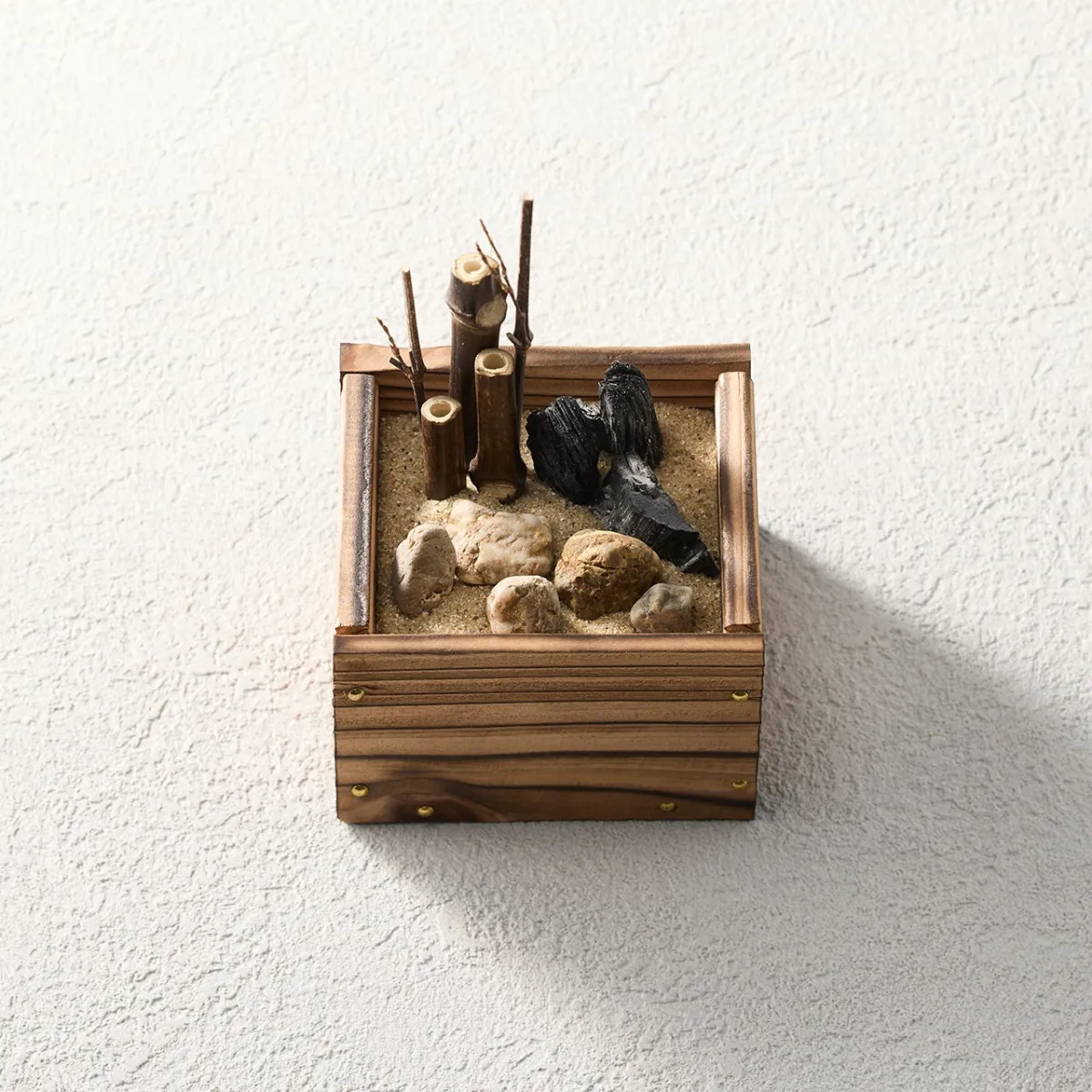 「しぜんの箱庭ラボ」のセット内容は、焼杉板の木箱(サイズ:9.5㎝×9.5㎝×6㎝)、抗菌効果のある紀州備長炭、および黒竹や景石など、自然素材が満載です。また、箱庭作りをサポートする冊子が付いており、SDGsを学ぶための情報も詰まっています。