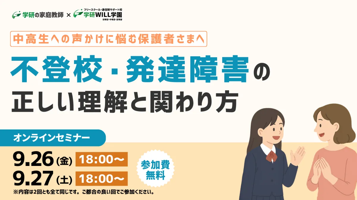 学研WILL学園が2025年9月26日(金)と27日(土)に、不登校や発達障害を抱えるお子様を持つ保護者のための無料オンラインセミナーを開催します。このセミナーでは、正しい理解と接し方のポイントについて詳しくお話しします。