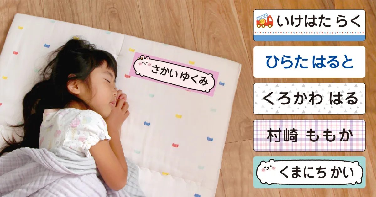 お名前シールは、お昼寝布団だけでなく、ブランケットやプール用バスタオル、靴袋などにも対応できるよう、サイズを選べるのも嬉しい点。様々なシーンで活躍するアイテムとして注目されています。