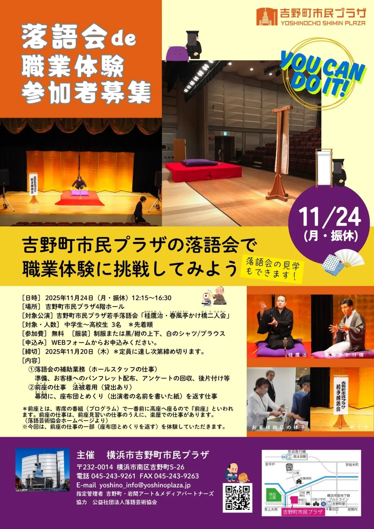 吉野町市民プラザでは、2025年11月24日(月・振休)に特別なイベント「落語会de職業体験」を開催します。このイベントは、中学生や高校生を対象にした職業体験で、落語会の雰囲気や裏側を知る貴重な機会です。参加者はホールスタッフや前座の業務を体験しながら、落語を楽しむことができます。興味のある方はぜひ応募してください。