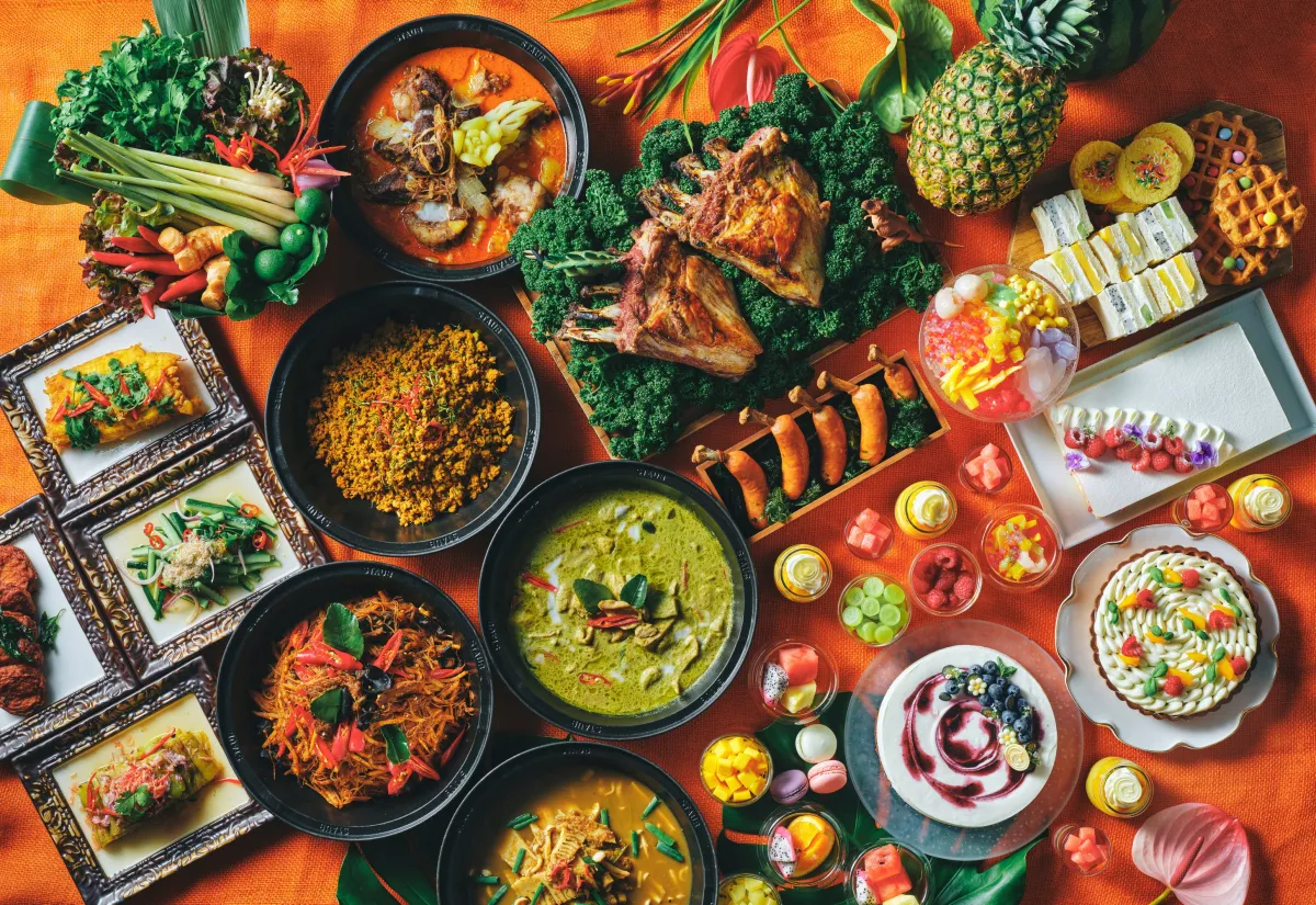 ビュッフェでは、タイの地域ごとの味を再現した本格的なカレーが日替わりで楽しめます。北部からはタマリンドの甘酸っぱさが引き立つ「ゲーン・ハンレー・ムー」、東北部からはハーブを使用したスッキリした味わいの「ゲーン・オム・ガイ」が登場します。南部からは海の幸を利用したカレーが、中央部からはグリーンカレーやマッサマンカレーが並び、タイの食文化を一度に味わうことができます。さらに、牛肉のマリネやタイ式オムレツと組み合わせて楽しむことができるのが、タイならではのスタイルです。